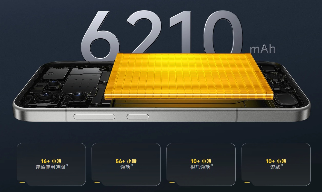 F8 Pro 採用 6210mAh 電池,支援 100W 極速快充,從 1% 充到滿僅需約 37 分鐘。官方也強調,經過 1600 次完整充電循環後,電池仍能保持 80% 以上健康度,換算日常使用可長達 4 年不明顯衰退。