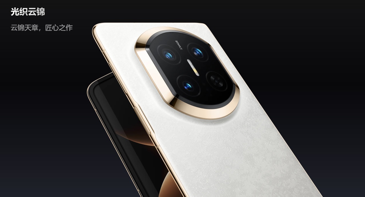 Mate X7 在設計上徹底革新,捨棄過去圓環相機模組,改以極具辨識度的「時空之門鏡頭設計」,在機背形成獨特的幾何光影效果;背蓋採用「光織雲錦」工藝,融合絲質紋理與金屬光澤,兼具時尚與高雅氣質。