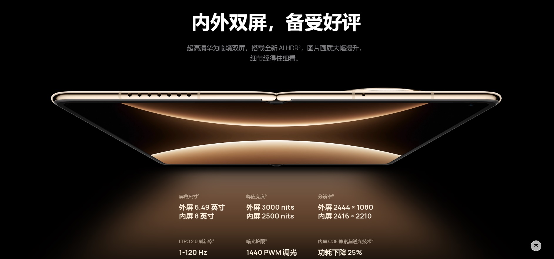 Mate X7 內外皆搭載高亮度 OLED 螢幕,外螢幕尺寸為 6.49 吋(2444×1080 解析度),支援 120Hz 更新率、3000nits 峰值亮度,合蓋使用時就像一般旗艦手機般順手自然。