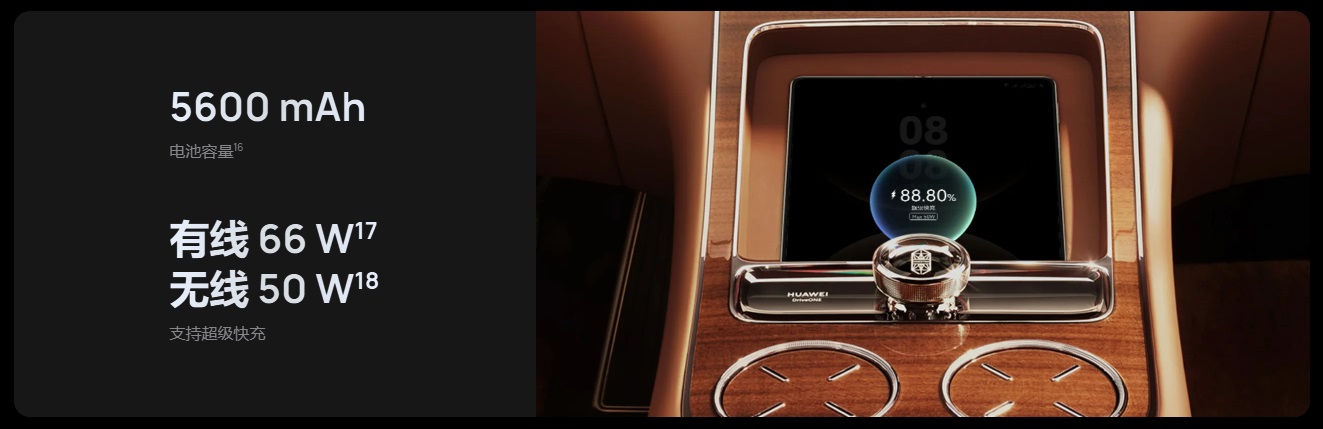 Mate X7 內建 5600mAh 矽碳負極電池,兼具高能量密度與長壽命特性;支援 66W 有線快充 與 50W 無線充電,不論是日常外出或長時間追劇,都能維持穩定續航。典藏版更搭配專屬快充組與精緻包裝,突顯高端定位。