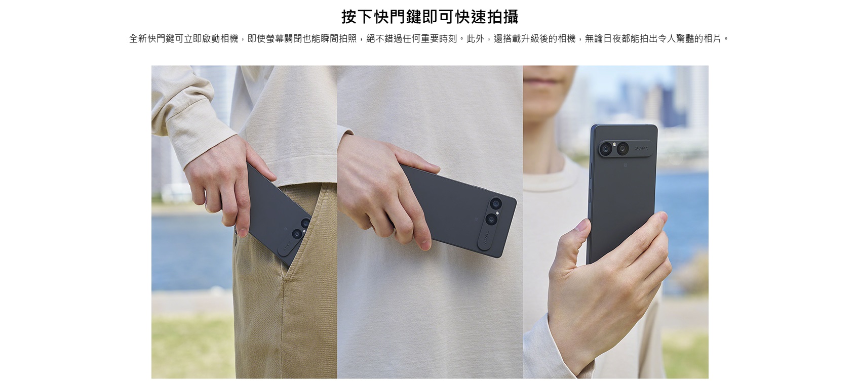 Sony 一直以影像技術聞名,這次 Xperia 10 VII 的 專屬快門鍵 是拍照愛好者的最愛。螢幕關閉狀態下也能一鍵開啟相機、瞬間拍攝,不再錯過任何精彩瞬間。