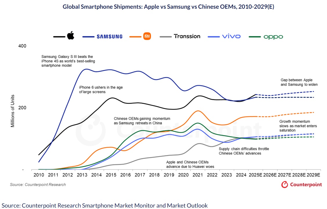 因此,Counterpoint 預測蘋果將在 2025 年開始到至少 2029 年 一直維持手機品牌領先地位。