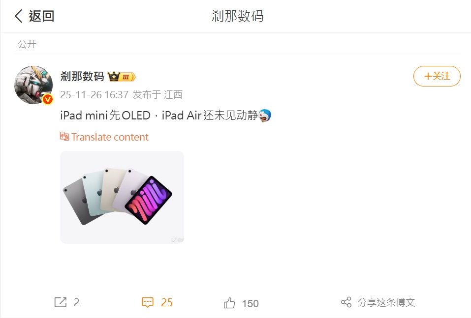 根據知名爆料者 剎那數碼 於中國微博上的最新消息,iPad mini 8 將是首款採用 OLED 面板的迷你 iPad,而 iPad Air 仍未看到相同升級的跡象。
