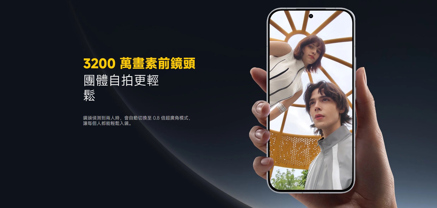 前鏡頭:為 3200 萬畫素,偵測到多人入鏡時會自動切換至廣角模式,團體自拍更輕鬆不失真。