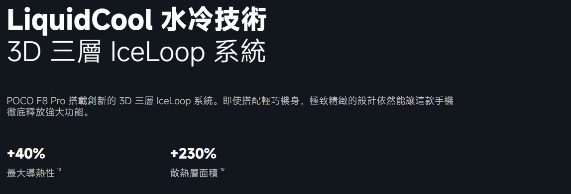 為了強化散熱,POCO 導入 LiquidCool 3D 三層 IceLoop 水冷系統,提升導熱性 40%,散熱面積更擴增 230%,有效降低高溫帶來的效能衰退。
