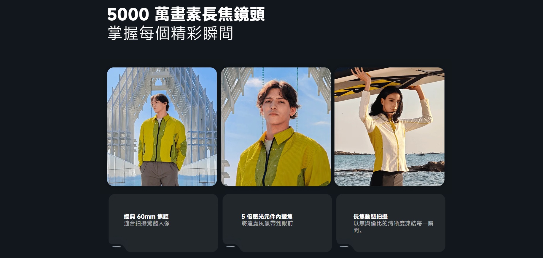 長焦鏡頭擁有經典 60mm 等效焦距,人像拍攝更立體自然;5 倍感光元件內變焦讓遠景依舊銳利。