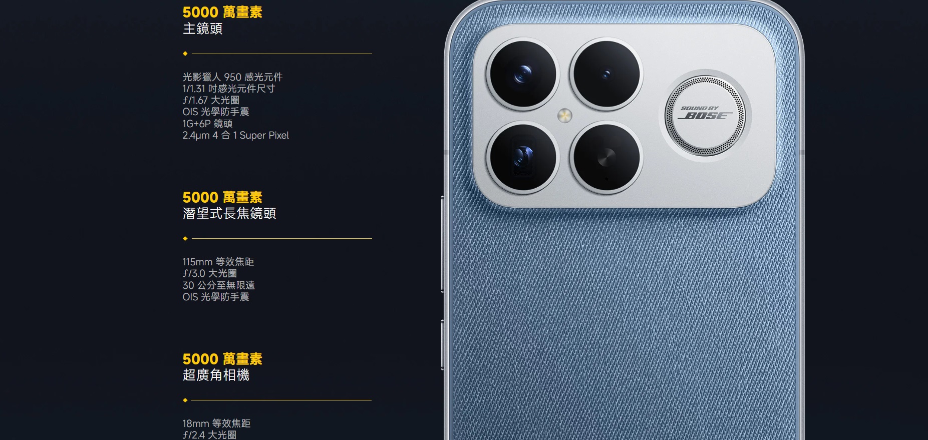 長焦鏡頭: 5000 萬畫素 5 倍潛望鏡頭,支援 10x 無損與 20x Ultra Zoom。