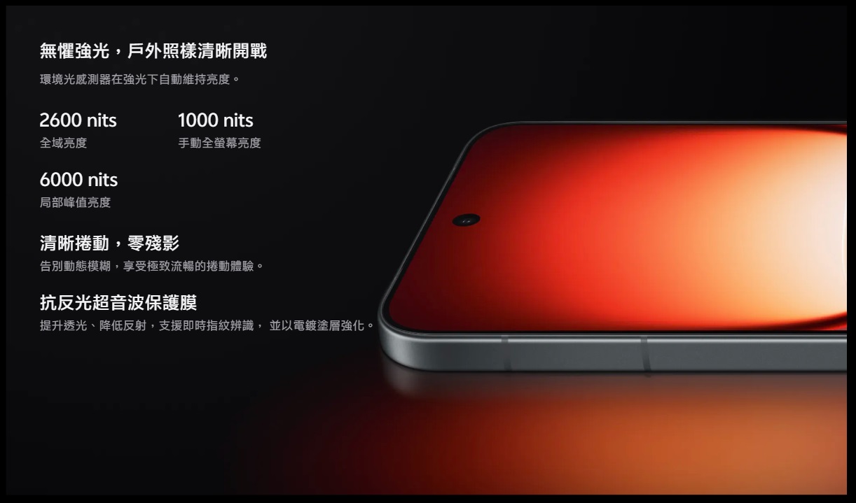 iQOO 15 採用 6.85 吋 Samsung 2K M14 LEAD OLED 螢幕,最高亮度達 6000 nits,畫面細膩、亮度極高;144Hz 更新率與 3200Hz 觸控採樣率讓操作反應更即時,適合重度手遊族。