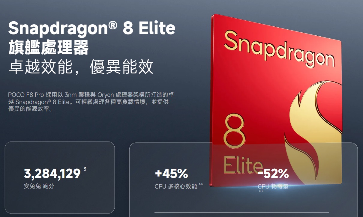 F8 Pro 搭載 Snapdragon 8 Elite 處理器,採用 3nm 製程 與 Oryon 架構,效能與能耗表現全面超越前代。