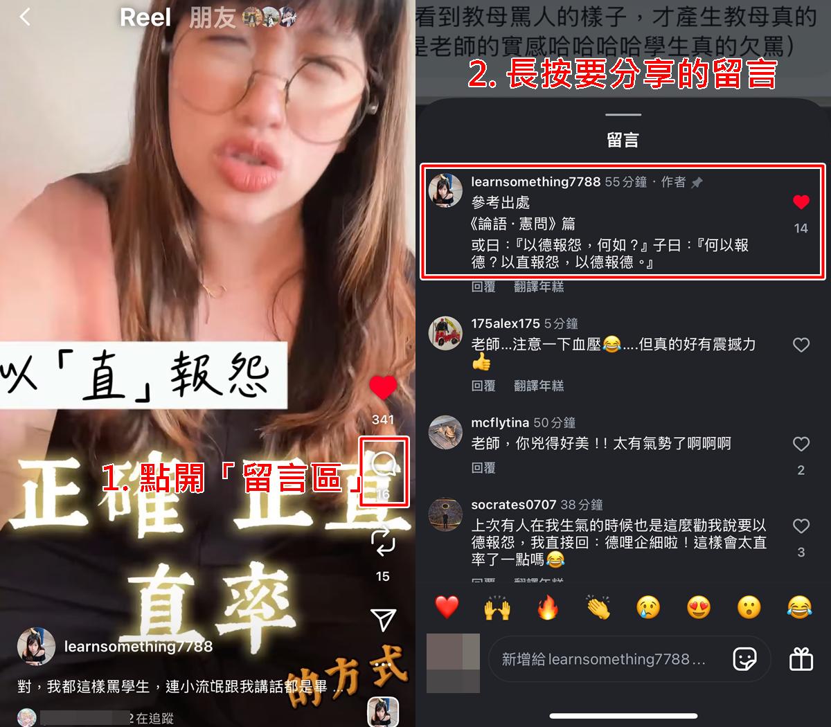 當你分享Instagram (IG)短影音或貼文時,如果也想一起分享底下的某則留言,請跟著下面的圖文步驟。