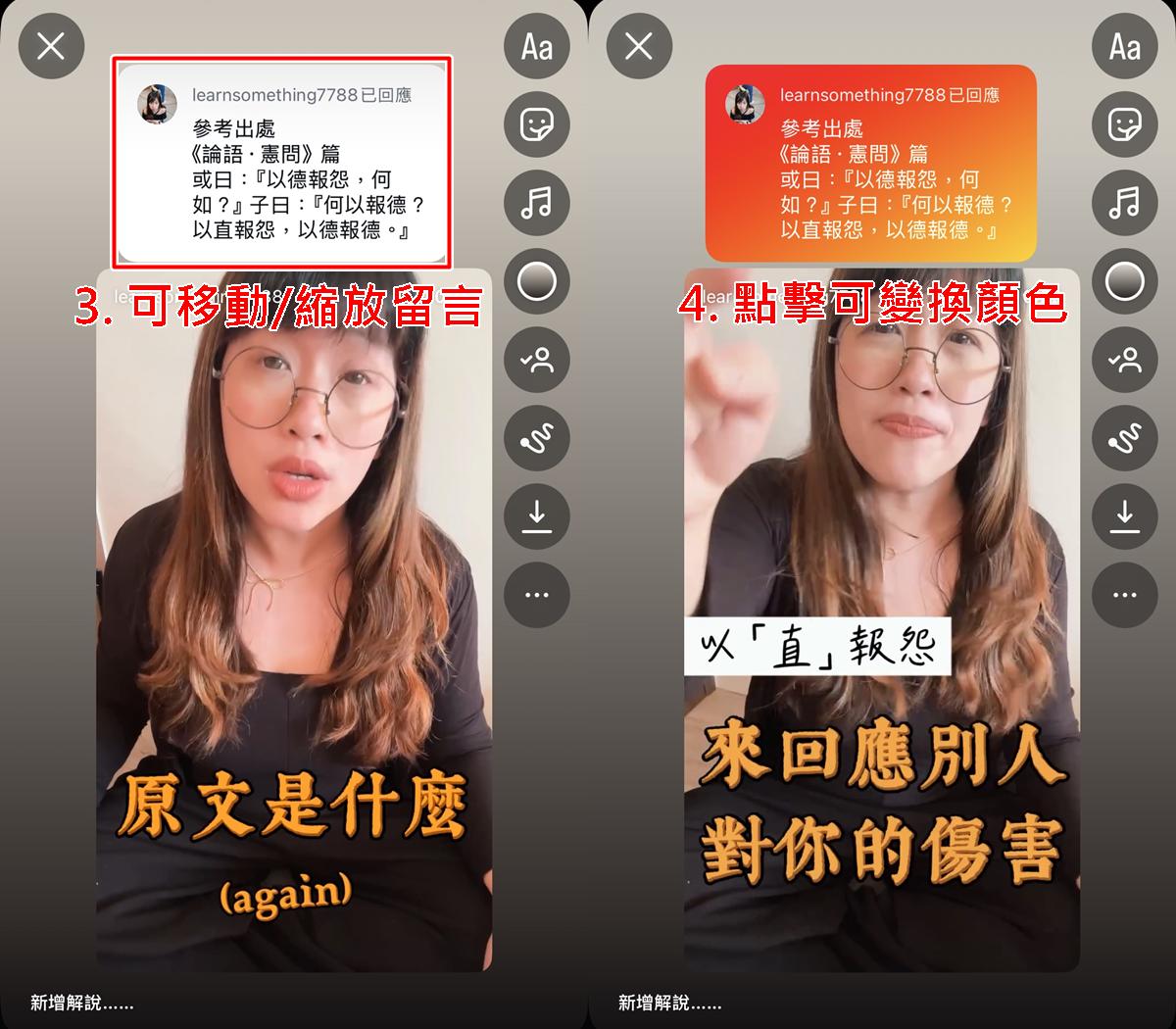 如果你目前還不能使用「限動分享留言」的功能(還未開放給你的IG帳號),也可以先「截圖留言」,再點擊分享貼文/影片,編輯限動時「加入留言截圖」即可;這也是一種替代方法。