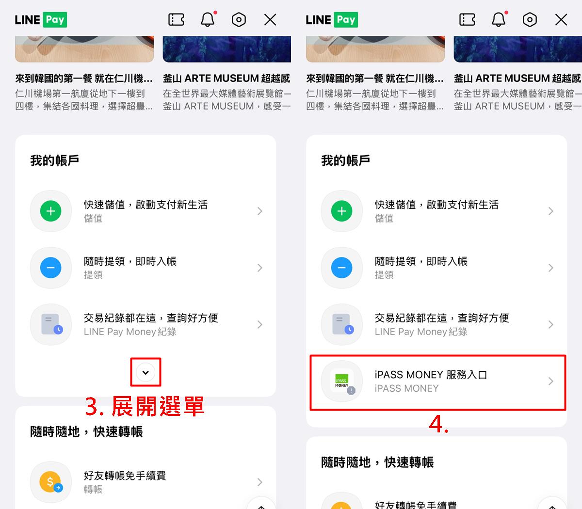 接著下滑看到「我的帳戶」,點擊「﹀」展開選單,就會看到「iPASS MONEY服務入口」,請點一下前往。