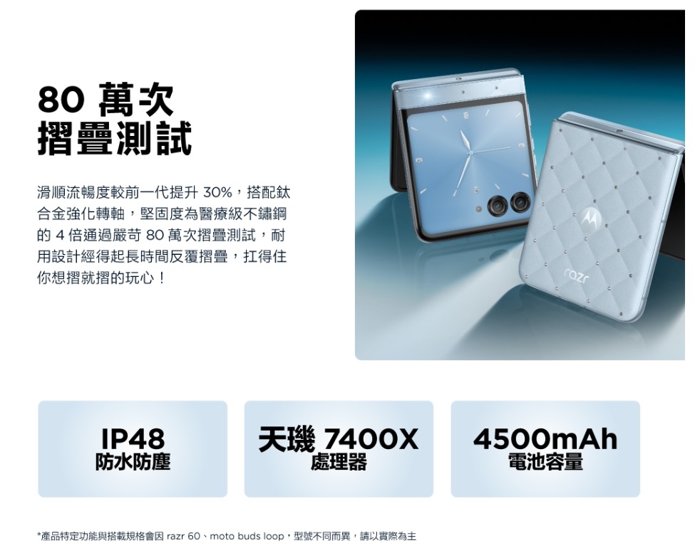 內螢幕則是 7 吋 AMOLED,最高亮度達 4500nits,比 Razr 60 來得更強大。鉸鏈結構採用 新一代鈦合金強化設計,摺疊次數比前代增加約三成,平整度也更高。