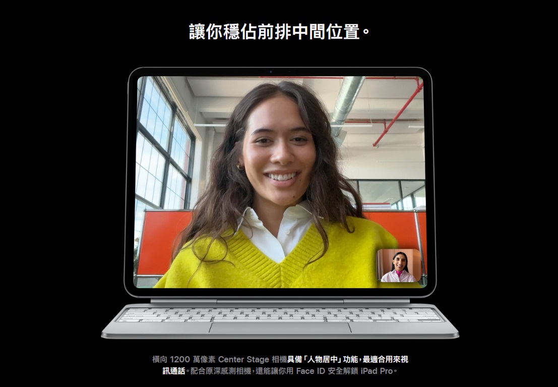 12MP前鏡頭 採橫向配置,適合視訊會議,搭配「人物居中」功能可自動追蹤主體;後鏡頭為 1200 萬畫素廣角,再加上 LiDAR 掃描儀,讓 AR、建模與空間量測更加精準。
