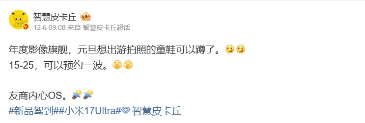 根據消息,小米計畫自 12 月 15 日起開放 小米 17 Ultra 的盲訂預約,為期 10 天,到 12 月 25 日結束。由於這樣的安排恰好卡在年底前,因此外界紛紛推測,小米會在 12 月 26 日選擇正式發表,完美呼應先前「今年內登場」的傳言。
