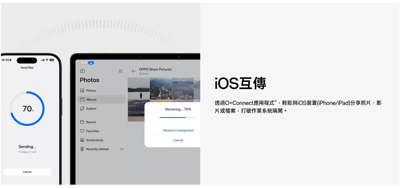比較特別的是,透過 O+ Connect 應用程式,OPPO Pad SE也能與 iPhone、iPad 進行檔案互傳,對同時使用 Android 與 iOS 的使用者來說更方便。