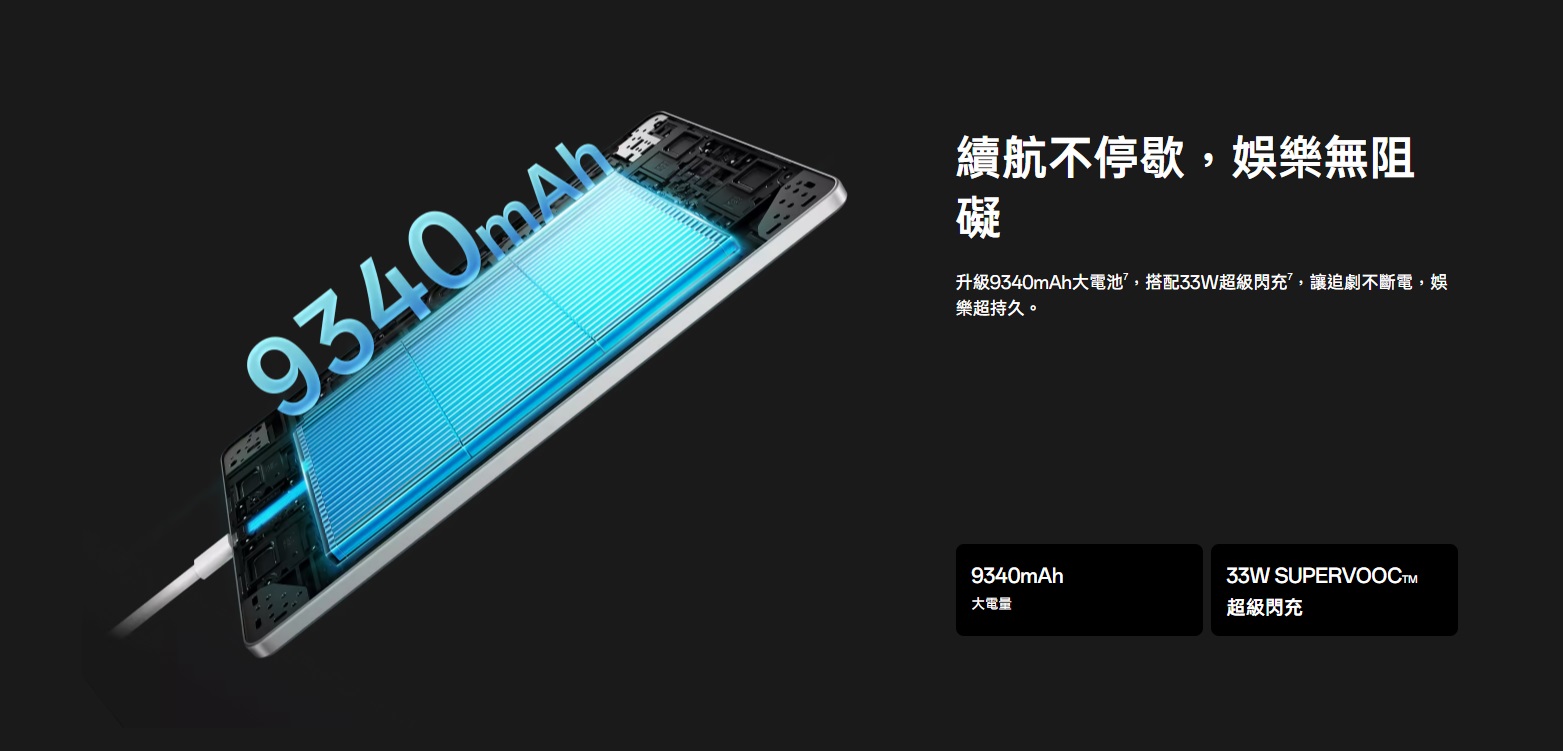 電池容量達 9340mAh,搭配 33W 快充,在同價位中算是相當有誠意,加上智慧休眠保電模式,長時間放著不用也不太掉電,非常適合「不是每天用,但需要時隨時能開機」的情境。