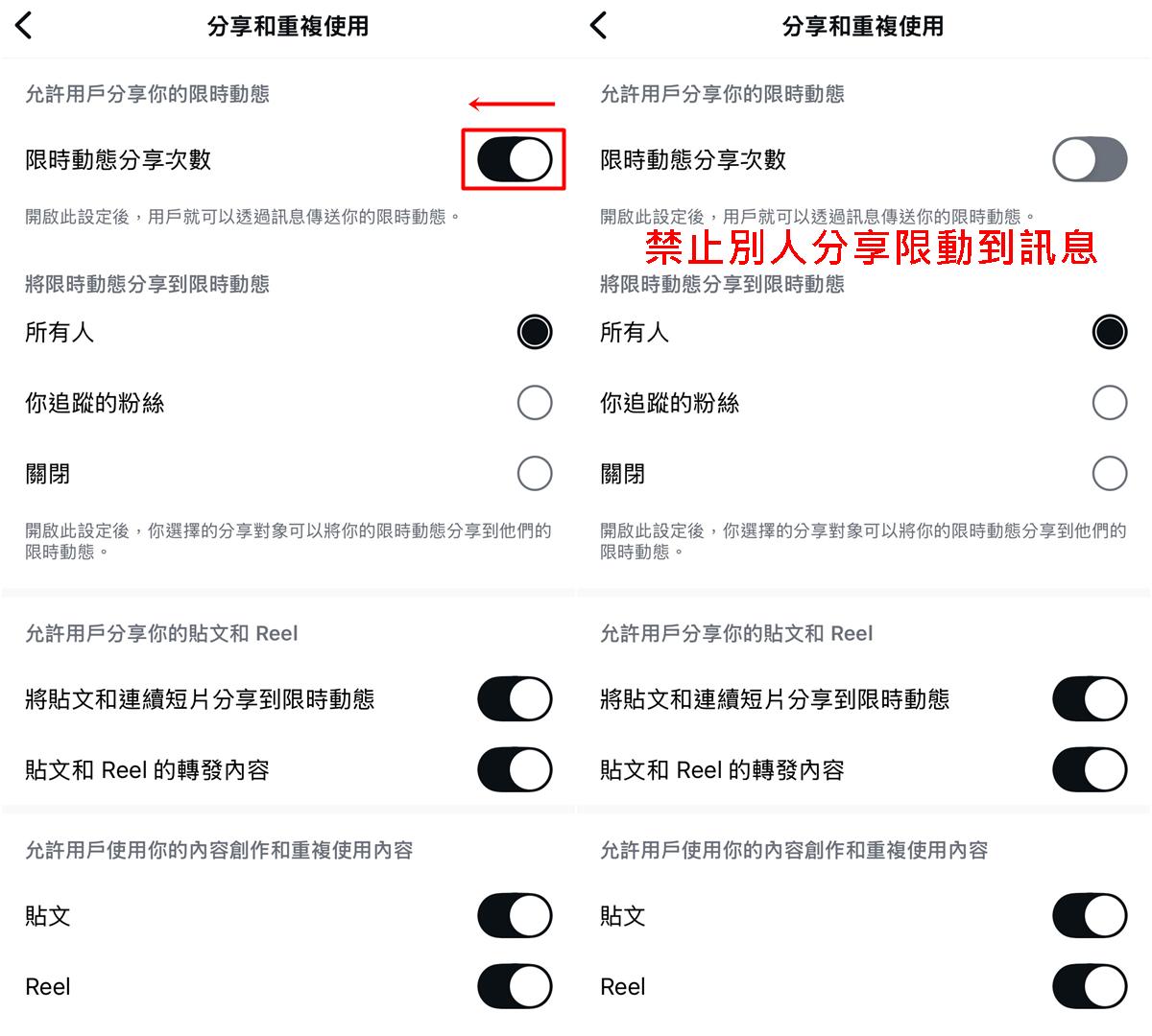 點選「分享和重複使用」後,如果你不想讓其他人分享你的限動到訊息(小盒子),請關閉「限時動態分享次數」的功能。