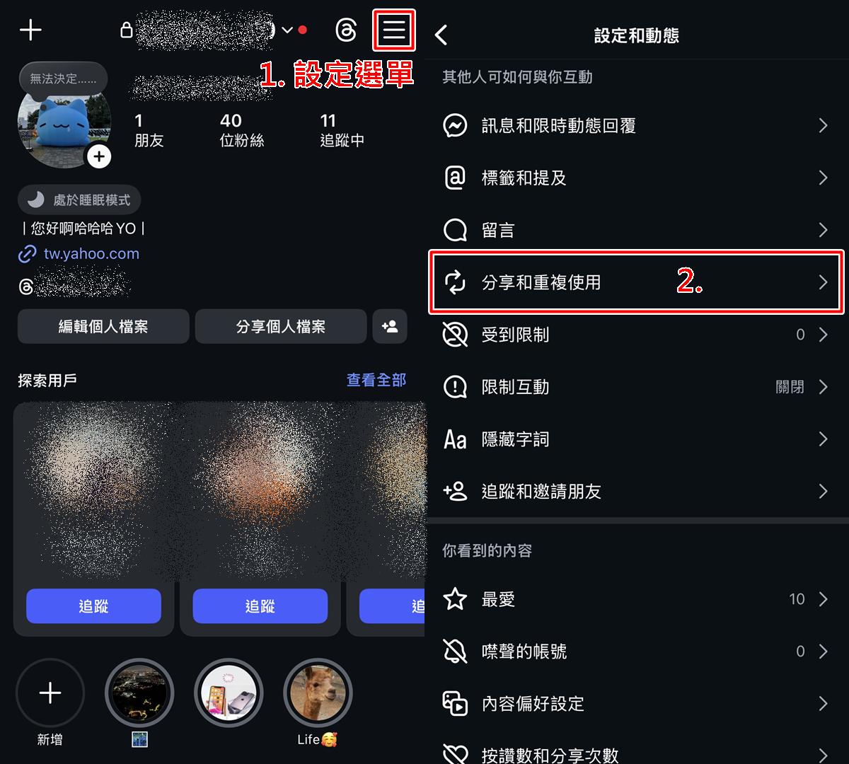 進入IG設定選單,點選「分享和重複使用」,關閉「限時動態分享次數」功能,再找到「將限時動態分享到限時動態」功能,根據個人需求,自訂限動的分享權限。