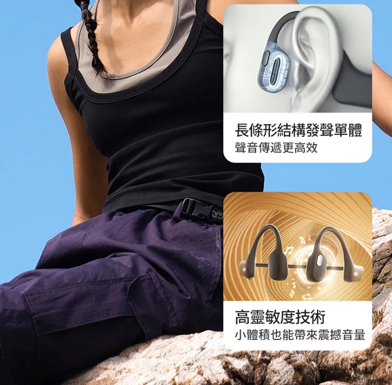 與傳統入耳式耳機不同,OpenRun Air S803 Air 採用 Open Ear 開放式設計,透過骨傳導方式傳遞聲音,耳道保持開放。這樣的設計,讓你在聽音樂或語音時,仍能清楚感知周圍環境聲。
