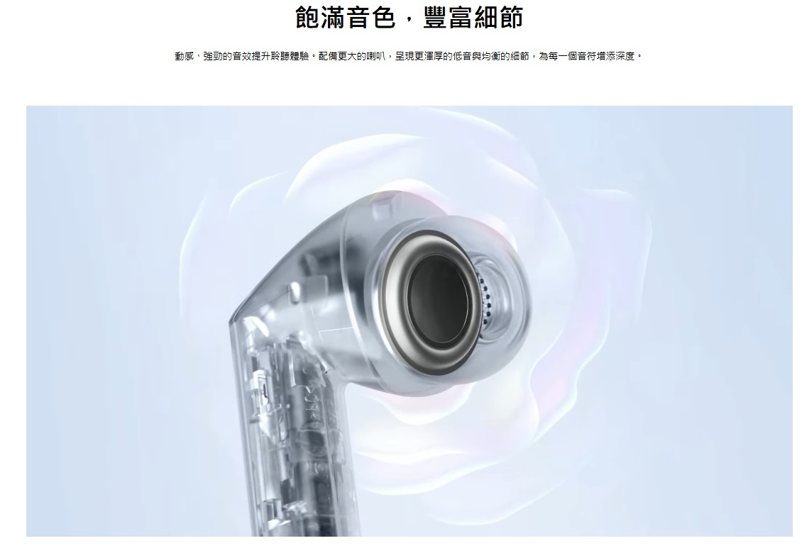 亮面金屬質感的外觀,看起來相當有科技味,目前提供「銀河灰」與「雲朵白」兩種顏色,視覺上比較高調、時尚;配戴方式為半入耳式,不需要深入耳道,對於不喜歡入耳式壓迫感的人來說更友善。