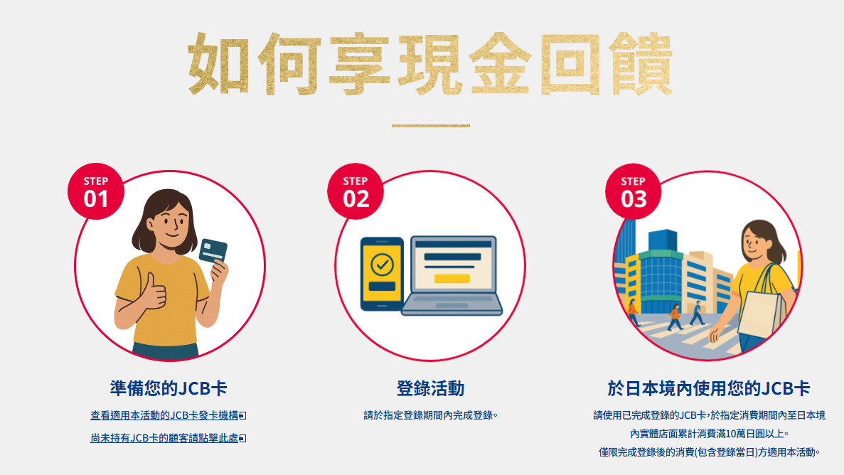 確認你所持的 JCB 卡符合活動規定,在指定登錄期間,前往 JCB 官網完成線上登錄。