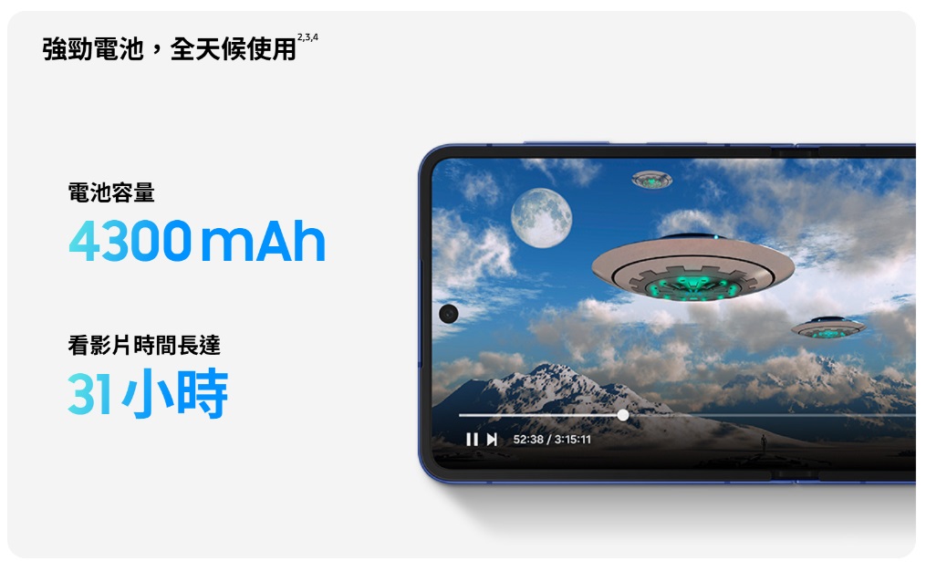 電池容量為 4300 mAh,在翻蓋手機中屬於大容量表現,實測影片播放可達約 31 小時。對於通勤族、學生或內容創作者來說,一天外出不用一直找插座。