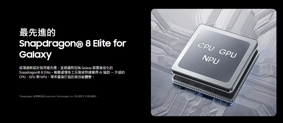 Z TriFold 採用 Snapdragon 8 Elite for Galaxy,效能與 AI 運算都屬於目前 Android 頂規水準。