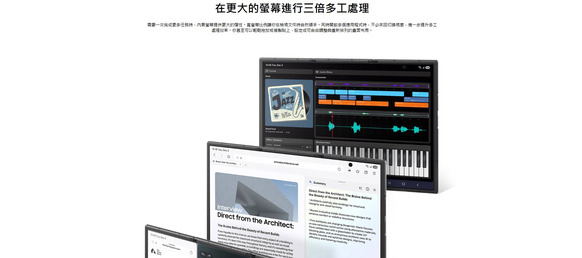 多工能力 為三星 Z TriFold 的核心能力,內建的多重視窗介面,讓你可以一邊開線上會議,一邊查看簡報、記錄筆記,甚至再開瀏覽器查資料,全都在同一台手機完成,大幅減少來回切換的時間成本。