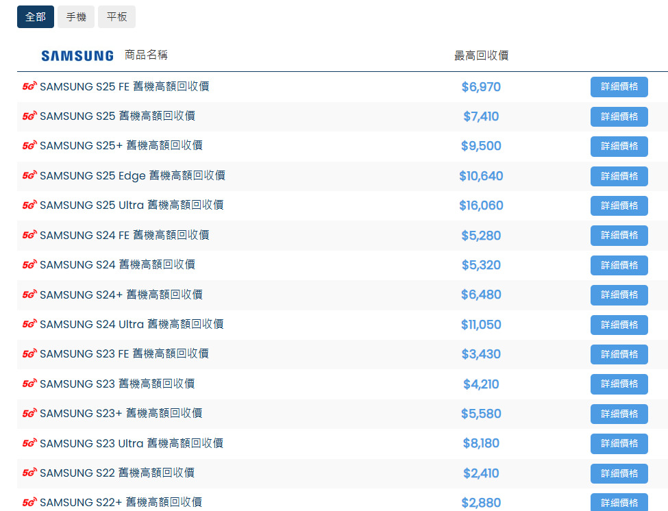 (*此為2026/1/25 三星手機回收參考價格表)