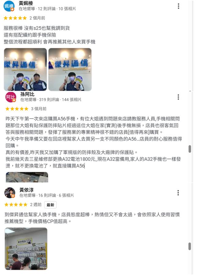 全台最大的連鎖通訊行-傑昇通信,在地深耕已長達40年了!至今也在 Google商店頁面累積數百萬筆的高星評論,而這些4、5星好評不是買廣告洗評價來的,有些評論不僅放上顧客和店員的合照、還有常客不斷回訪,給予我們最真心的意見回饋!像是就有消費者表示:「來做平板估價回收,現場工作人員帥氣且服務好,環境也很棒」、「服務很棒!問了其他店都說手機沒貨,傑昇店員特地幫我調到貨」、「跑一趟就能解決全部的問題,手機、配件樣樣齊全,服務速度快又專業」......等,可見傑昇通信的好口碑,都是真實且值得信賴的呢!