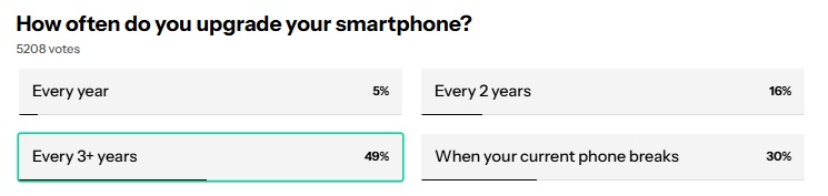 這次調查共吸引超過五千名讀者參與,結果相當明確:約49%表示,會使用手機三年甚至更久才更換;30%的人壞掉再換;16%的人兩年換;僅有約5%的人每年換。