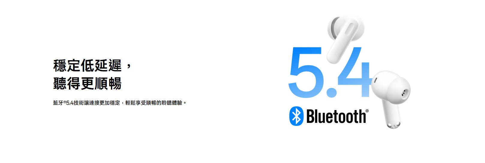連線方面支援 藍牙 5.4,穩定度高、延遲低,並有電競模式可將延遲壓低到約 47ms,玩遊戲或看影片幾乎感覺不到聲畫不同步。