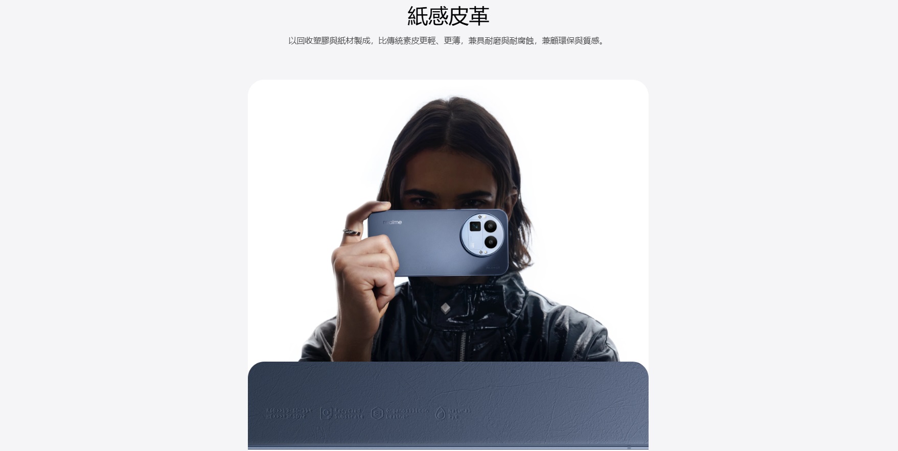 背蓋採用獨特的紙感皮革材質,結合光學奈米雕刻工藝,摸起來細膩、有紋理,不滑手、不黏指紋,而且比傳統素皮更輕薄耐用,同時也兼顧環保概念。