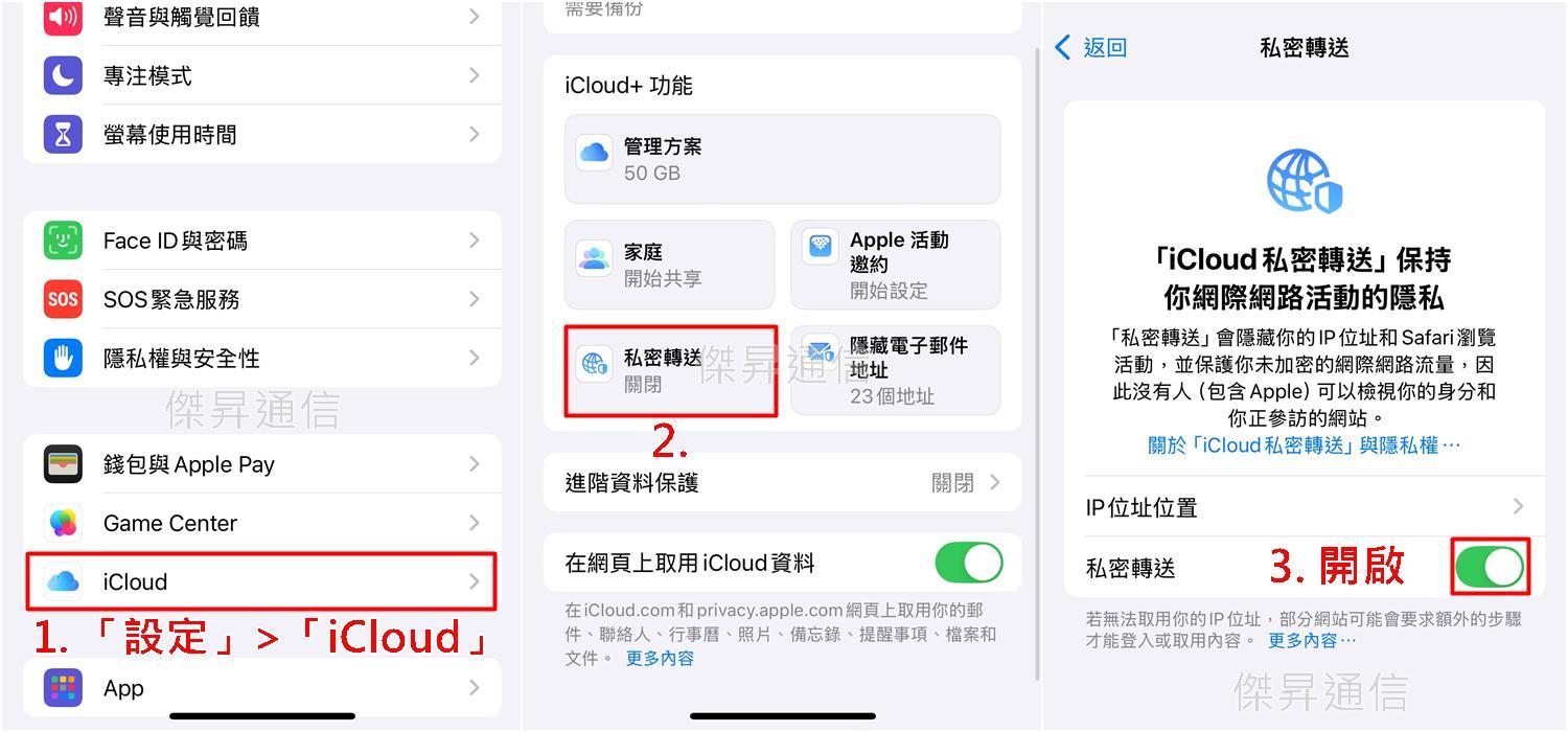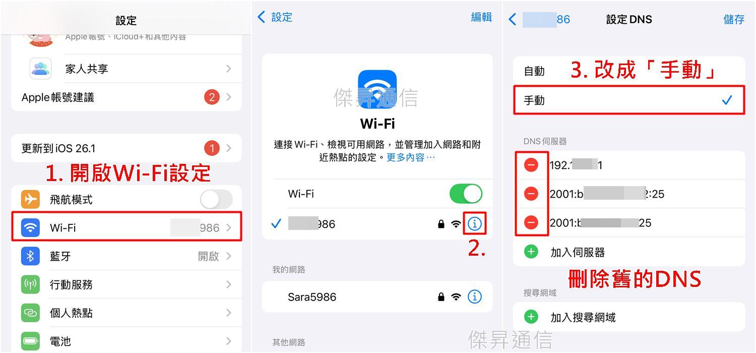 進入iOS「設定」,選擇你連線中Wi-Fi右邊的「i」,勾選「手動」,點擊「⛔」刪除舊的DNS伺服器,按下「+ 加入伺服器」,輸入「1.1.1.1」或「8.8.8.8」再儲存即可;或是在「設定」選擇「iCloud」,開啟「私密轉送」。