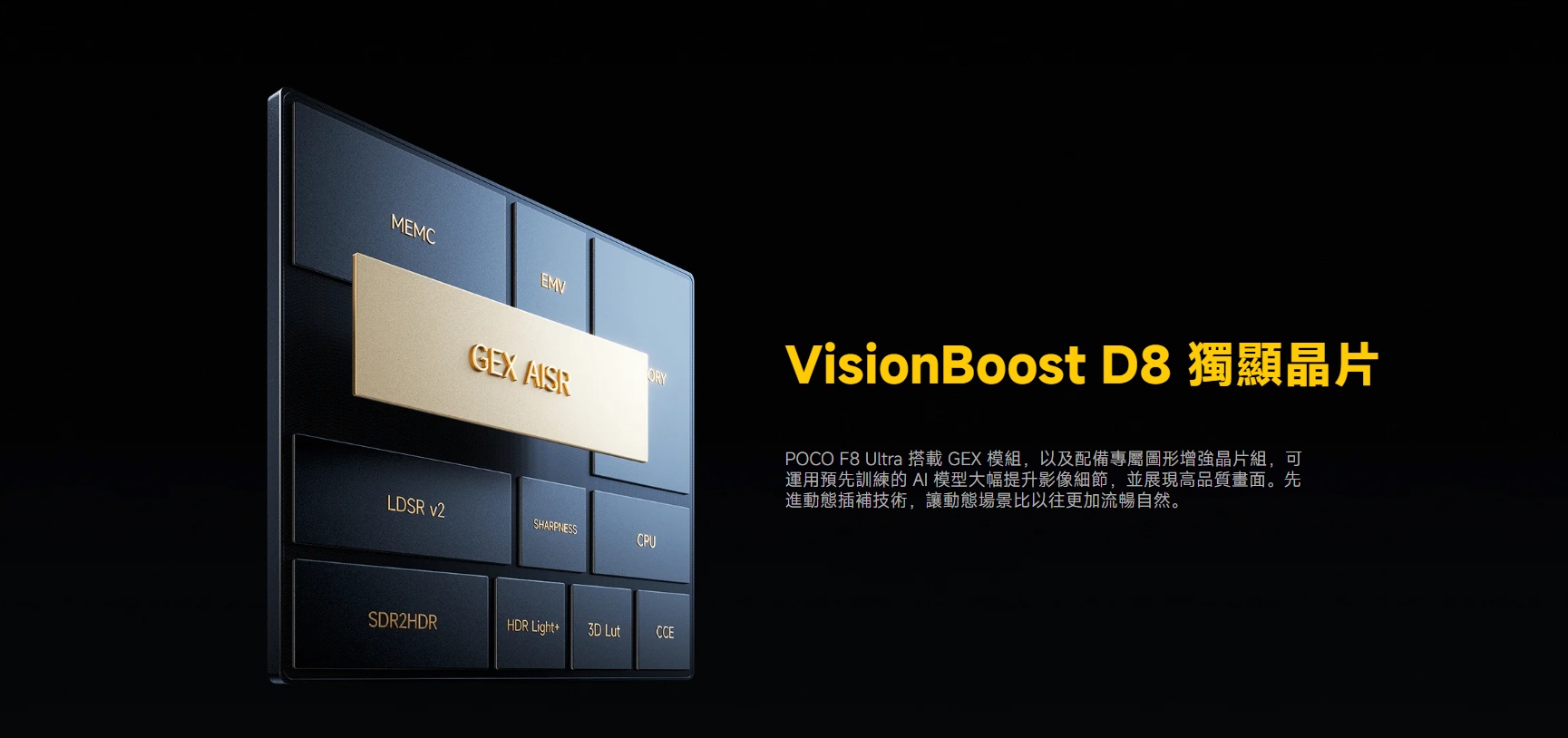 POCO F8 Ultra 同樣使用 Snapdragon 8 Elite Gen 5,進一步加入 VisionBoost D8 獨顯晶片,這讓它在插幀、HDR 強化、AI 超解析等方面特別有感。