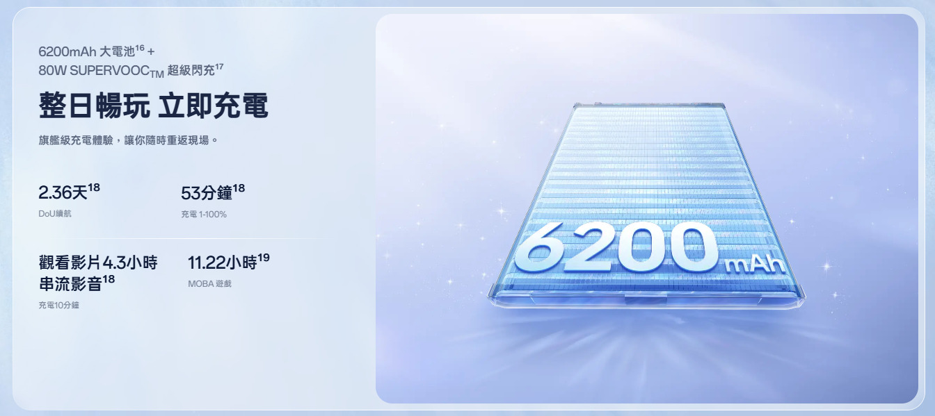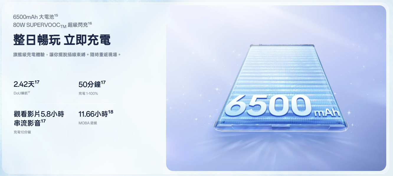 電池容量來到約 6500mAh,並支援 80W SUPERVOOC 快充,實測情境下,一天高強度使用也不成問題,補電速度快,對通勤族與學生族相當友善。