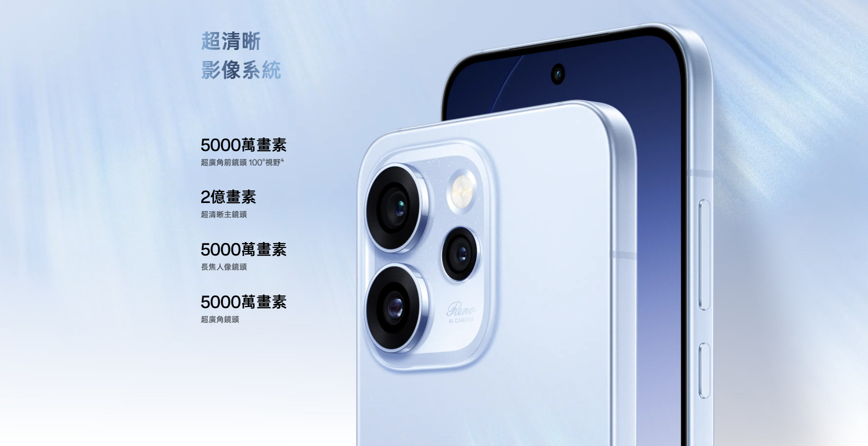 Reno15 主打「人像好拍」,後鏡頭配置為 5000 萬畫素主鏡頭+5000 萬畫素長焦人像鏡頭+800 萬畫素超廣角,搭配 3.5 倍長焦氛圍人像,拍人像時背景壓縮自然、主體突出。