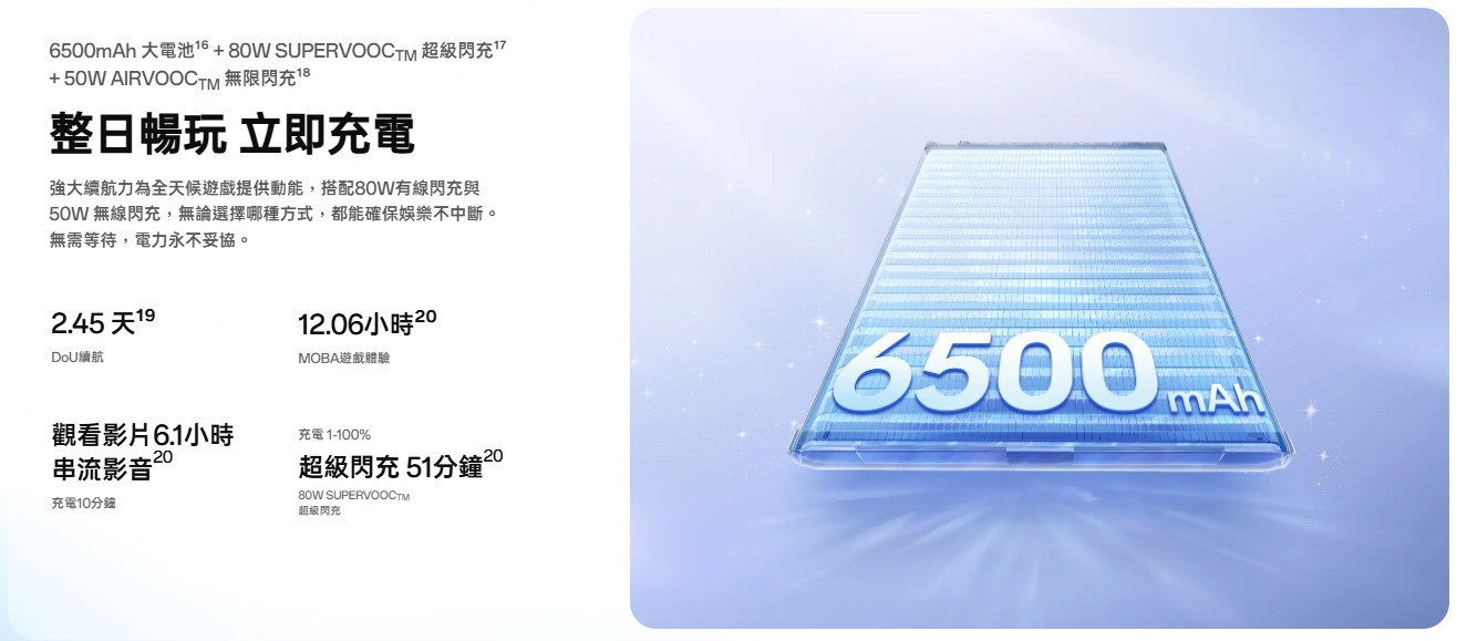 電池為 6500mAh,加上 80W SUPERVOOC 快充,通勤族或學生族群,幾乎不用為電量焦慮。