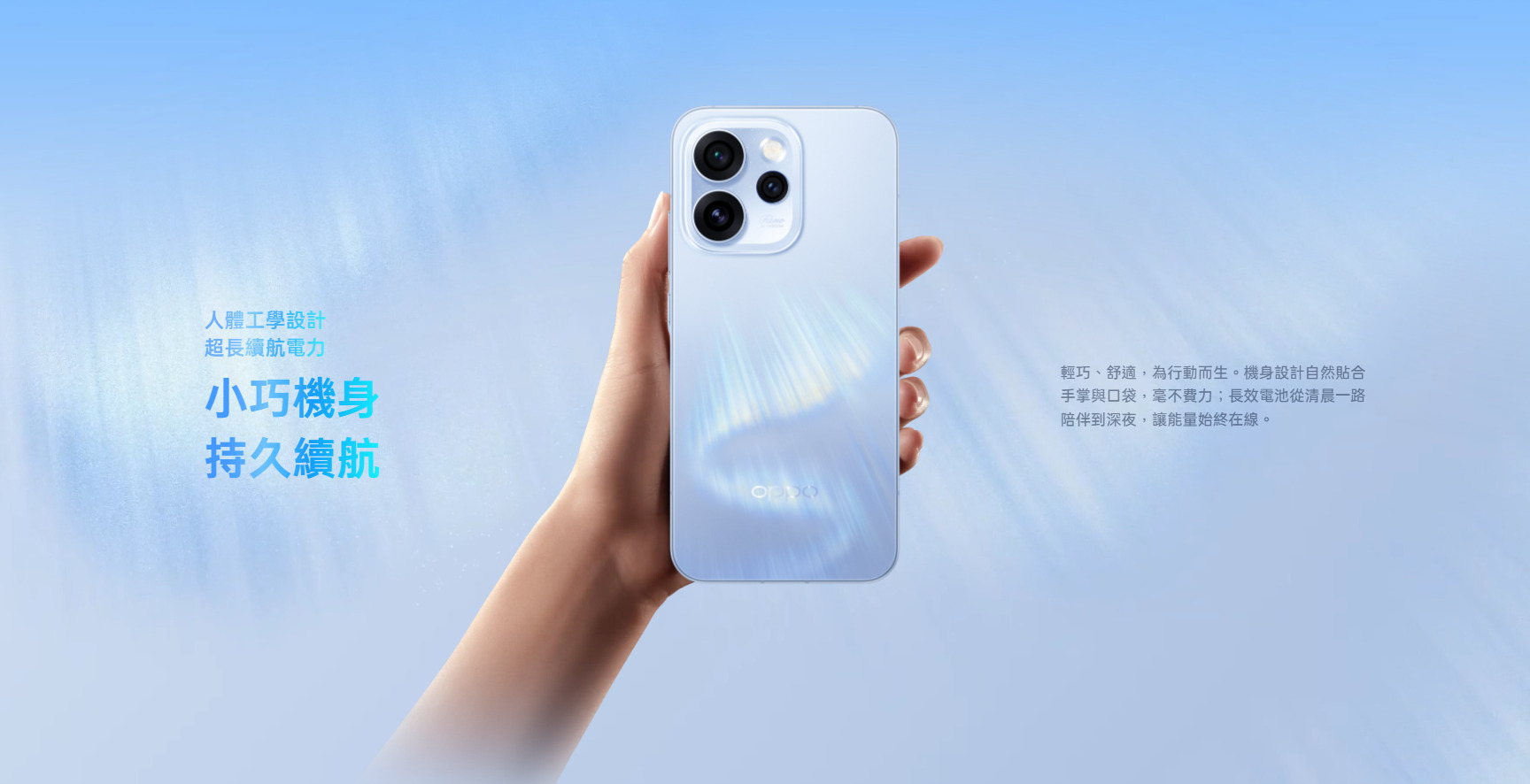 Reno15 Pro 的第一眼印象,來自它極具辨識度的極光靈感設計,並提供「極光白、蒼穹藍」兩色。