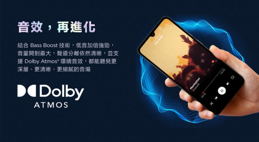 螢幕支援 120Hz 更新率,滑動頁面時的順暢感更舒適,這點在同價位手機中相當加分;搭配 Dolby Atmos 與 Bass Boost 雙立體聲喇叭,聲音層次比一般單喇叭更立體,追劇或玩遊戲時更有臨場感。