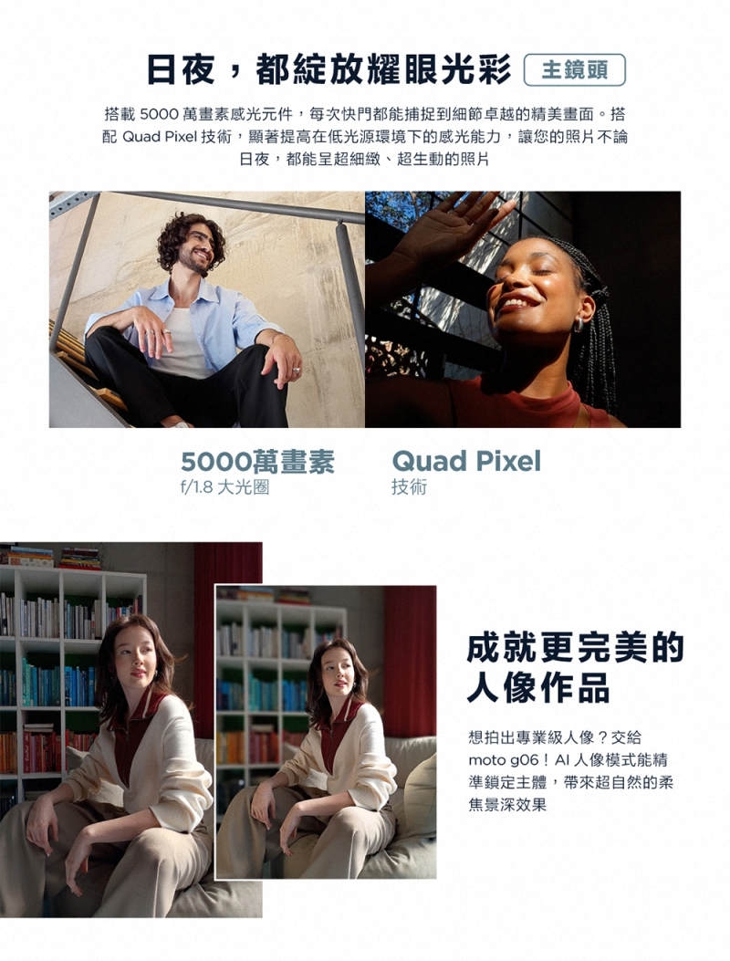 拍照方面,Moto g06 搭載 5,000 萬畫素後置主鏡頭,白天拍照清晰銳利,結合 Quad Pixel 四合一畫素技術與 AI 影像演算法,拍出來的照片色彩自然、不會過度修飾。