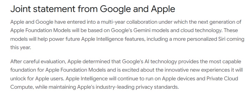 Google 官方部落格聲明中指出,經過長時間評估後,蘋果認為 Google 的技術最適合作為「Apple Foundation Models」的核心基礎,能為用戶帶來更多創新體驗。