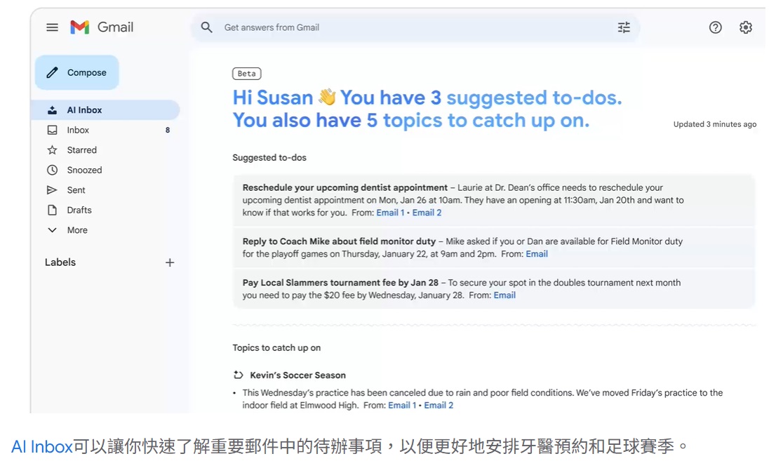 以下整理 Gmail 在 2026 年的重要 AI 方向與 3個未來將陸續推出的新功能。目前功能暫先於美國使用,後續逐步推向全球。