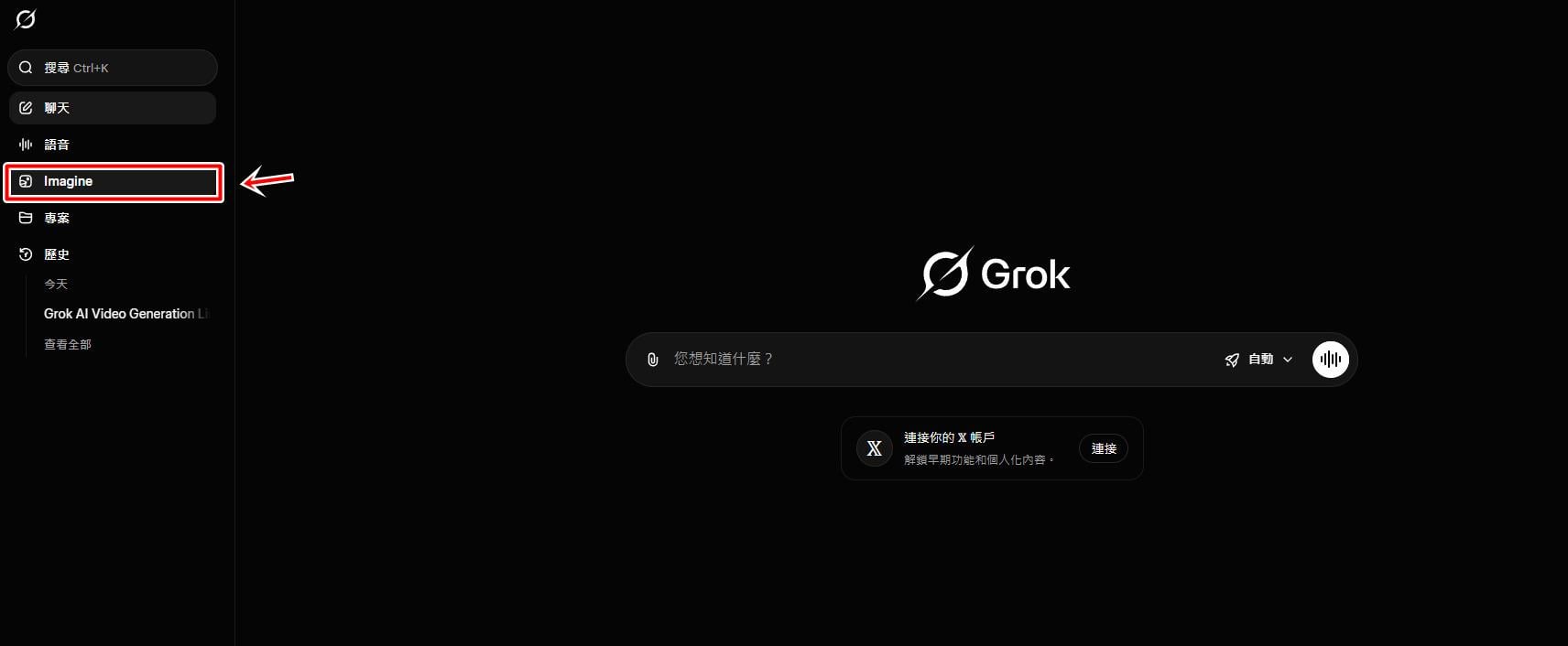 點擊下方傳送門進入「Grok」官網, 在左排選單點擊「Imagine」,然後在底下切換成「影片」模式。