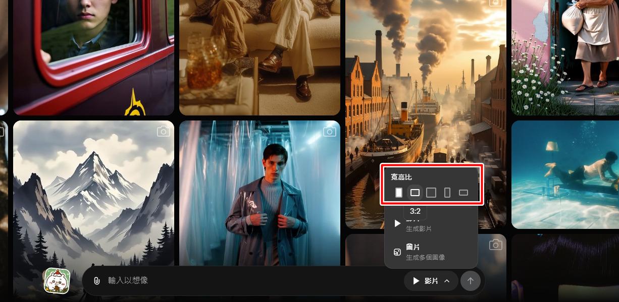 你可以自訂AI影片/圖片的輸出格式、畫面寬高比例(如:2:3、1:1、16:9、9:16)等等。