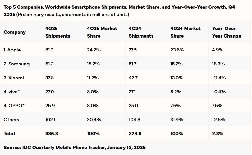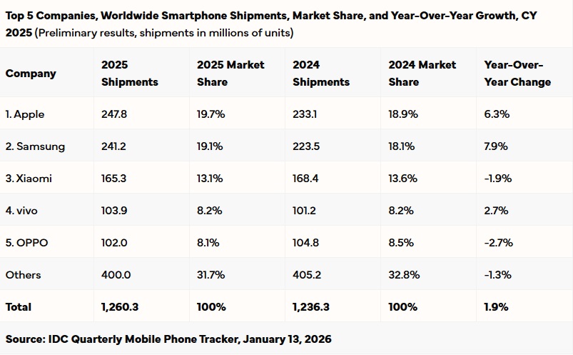 2025 Q4:蘋果單季稱王,三星成長幅度更亮眼