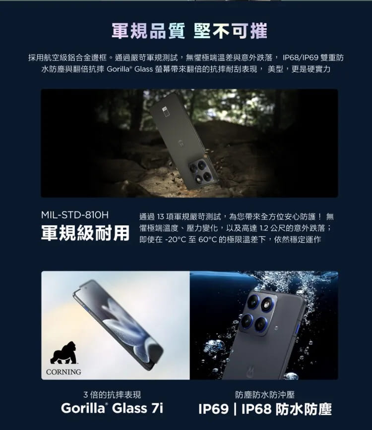 耐用性也是一大重點,edge 70 通過 MIL-STD-810H 軍規測試,並具備 IP68 / IP69 防水防塵,再加上 Gorilla Glass 7i 玻璃保護,日常使用更安心,不怕一點碰撞或突發狀況。