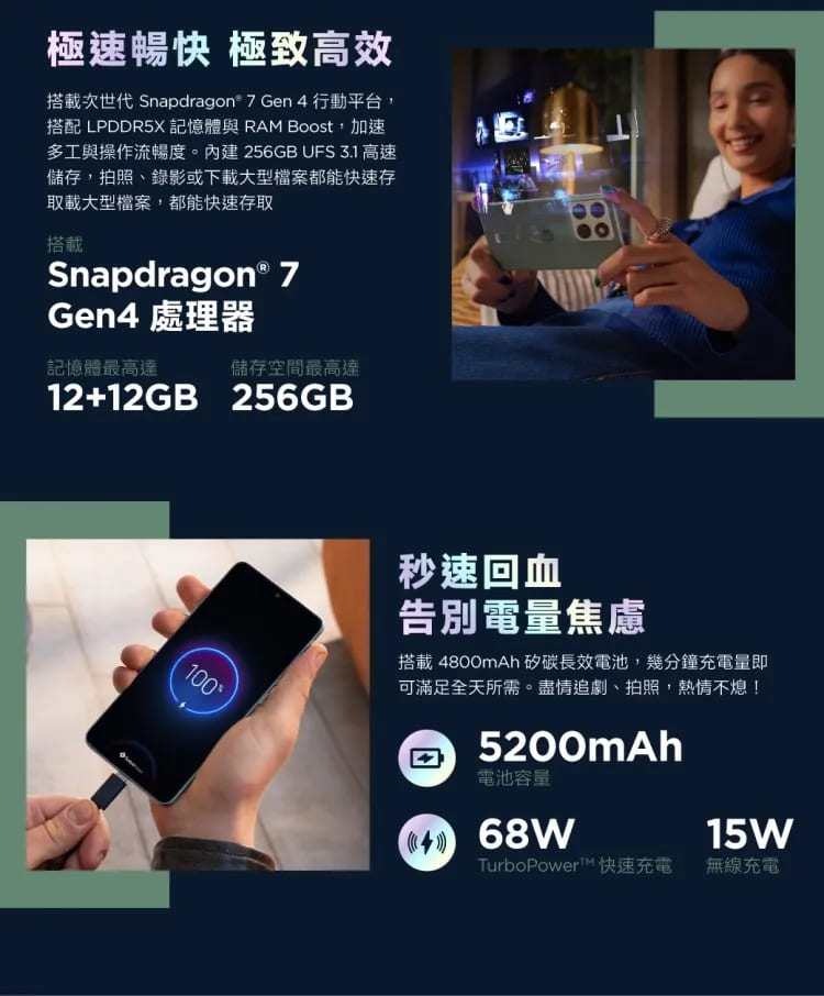 edge 70 搭載 Snapdragon 7 Gen 4 處理器,定位屬於高階中階晶片,日常操作、多工切換、社群與影音播放都非常順暢。