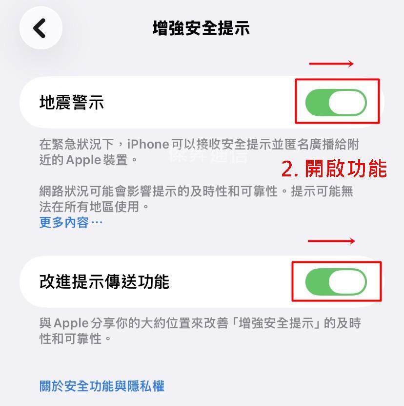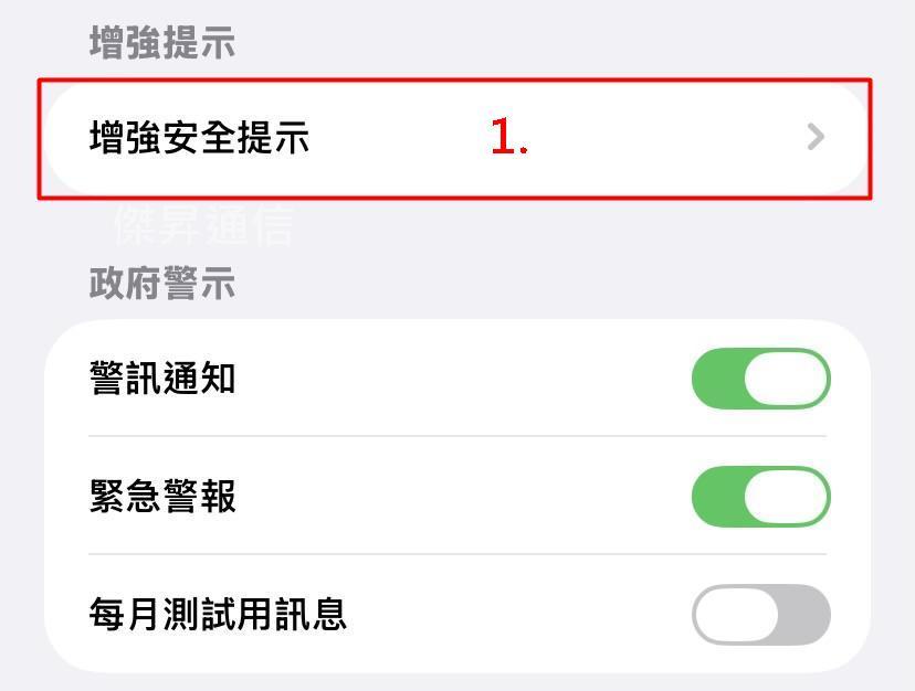 滑到底部「政府警示」>「增強性安全警示」,開啟「地震警示」和「改進提示傳送功能」。